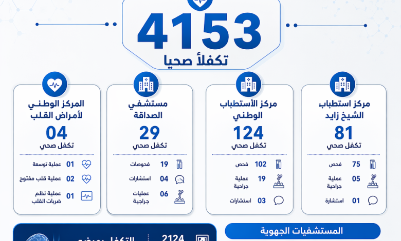 وفي تفاصيل باقي المؤسسات، سجل مركز الاستطباب الوطني 124 تكفلاً صحياً، منها 102 فحصاً و19 عملية جراحية و3 استشارات، بينما بلغ عدد التكفلات في مركز استطباب الشيخ زايد 81 تكفلاً، بينها 75 فحصاً و5 عمليات جراحية واستشارة واحدة.